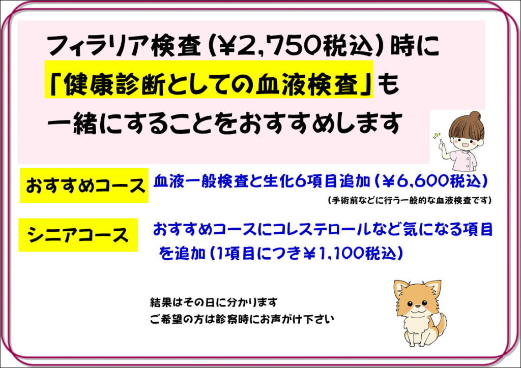 また、フィラリア検査の時に、健診も兼ねた血液検査も一緒にできます