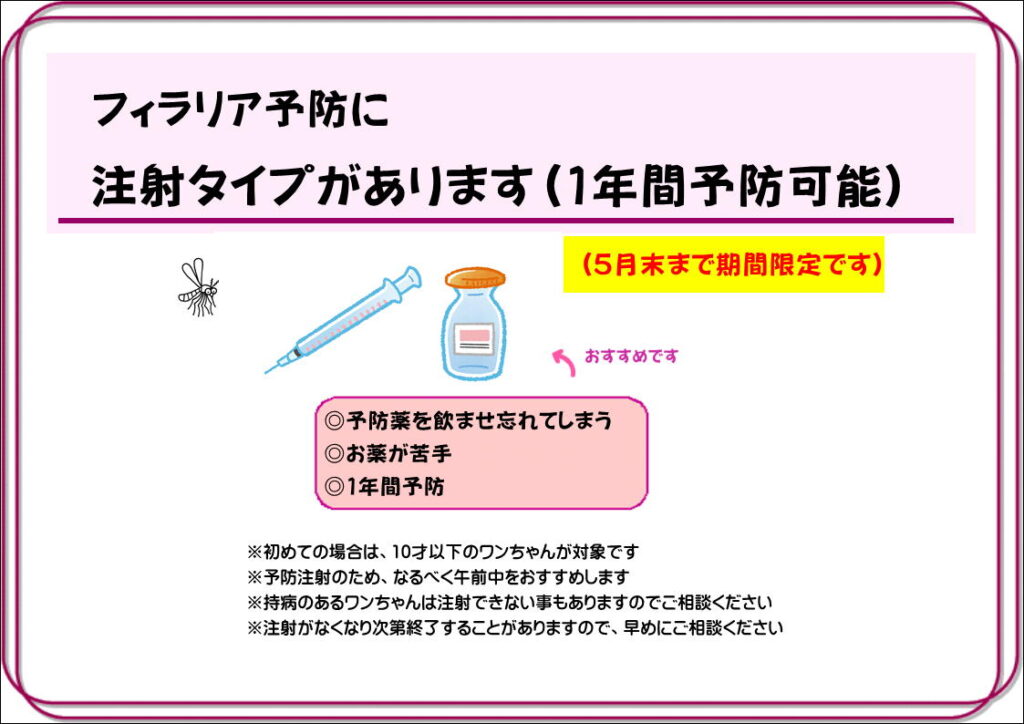 フィラリア予防薬は、飲み薬、塗布剤の他に1年間予防ができる注射があります