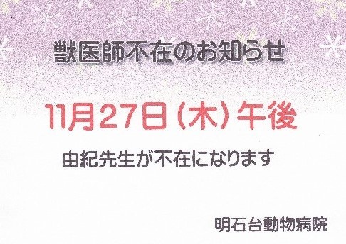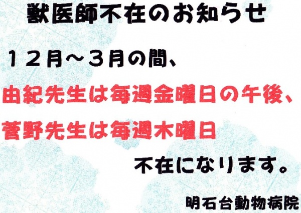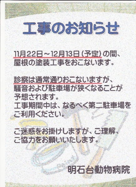 2014.11.29 中学生の職場体験 レントゲンや手術器具に興味深々・・・ アキコがモデル犬となって聴診などを体験してもらいました。 「うわー、心臓早いね!」とびっくり。 アキコはきっと緊張して心…… 2014.11.23 獣医師不在のお知らせ …… 2014.11.21 12月から3月までの予定 …… 2014.11.11 工事のお知らせ 新しくきれいな街にふさわしい病院であるために、今月22日からリニューアルします。 屋根や外壁の塗装工事をします。 足場を組みますので、駐車場が狭くなります。 …… Page 1 of 212次へ ›