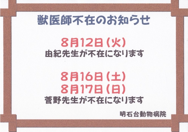 2014.8.5 獣医師不在のお知らせ …… 2014.7.22 犬の熱中症週間予報!! ワンちゃんは毛皮をいつも着ているようなもの。 また、人のように汗で体温調整をする事ができません。 人にとっては大丈夫・・と思っても、ワンちゃんにとっては熱中症…… 2014.7.14 お盆休みのお知らせ …… 2014.6.18 投薬に便利!「ピルポケット」 ところで、毎年、薬飲ませるの大変なんです(汗)というワンちゃんいますよね。 そんな時は、ピルポケットを試してみませんか? 粘土みたいに柔らかいので薬を簡単に包…… Page 95 of 107« 最初へ‹ 前へ9394959697次へ ›最後へ »